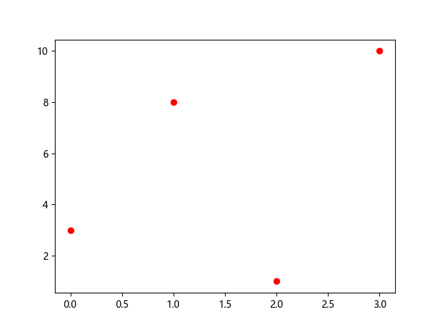 # 这三行代码使编译器能够绘图: import sys import matplotlib matplotlib.use('Agg') import matplotlib.pyplot as plt import numpy as np ypoints = np.array([3, 8, 1, 10]) # 使用红色(r)圆形(o)标记绘制 plt.plot(ypoints, 'or') plt.show() # 这两行代码使编译器能够输出图形: plt.savefig(sys.stdout.buffer) sys.stdout.flush()