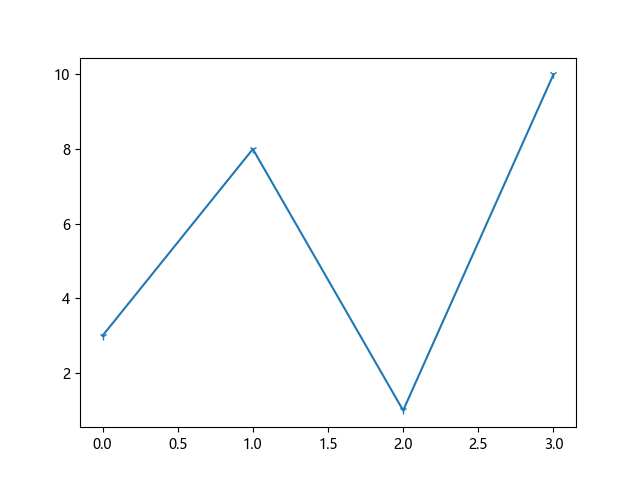 # 这三行代码使编译器能够绘图: import sys import matplotlib matplotlib.use('Agg') import matplotlib.pyplot as plt import numpy as np ypoints = np.array([3, 8, 1, 10]) # 使用朝下的三线标记绘制 plt.plot(ypoints, marker = '1') plt.show() # 这两行代码使编译器能够输出图形: plt.savefig(sys.stdout.buffer) sys.stdout.flush()