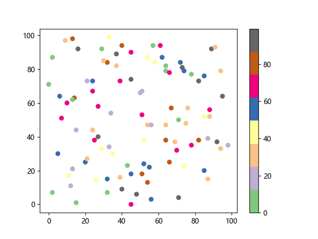 # 这三行代码使编译器能够绘图: import sys import matplotlib matplotlib.use('Agg') import matplotlib.pyplot as plt import numpy as np x = np.random.randint(100, size=(100)) y = np.random.randint(100, size=(100)) colors = np.random.randint(100, size=(100)) # 使用强调色系绘制散点图: plt.scatter(x, y, c=colors, cmap='Accent') plt.colorbar() plt.show() # 这两行代码使编译器能够输出图形: plt.savefig(sys.stdout.buffer) sys.stdout.flush()