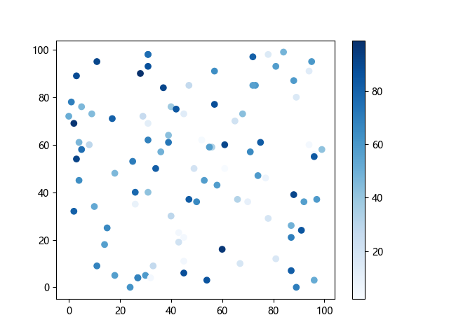 # 这三行代码使编译器能够绘图: import sys import matplotlib matplotlib.use('Agg') import matplotlib.pyplot as plt import numpy as np x = np.random.randint(100, size=(100)) y = np.random.randint(100, size=(100)) colors = np.random.randint(100, size=(100)) # 使用蓝色渐变绘制散点图: plt.scatter(x, y, c=colors, cmap='Blues') plt.colorbar() # 显示颜色条 plt.show() # 显示图形 # 这两行代码使编译器能够输出图形: plt.savefig(sys.stdout.buffer) sys.stdout.flush()