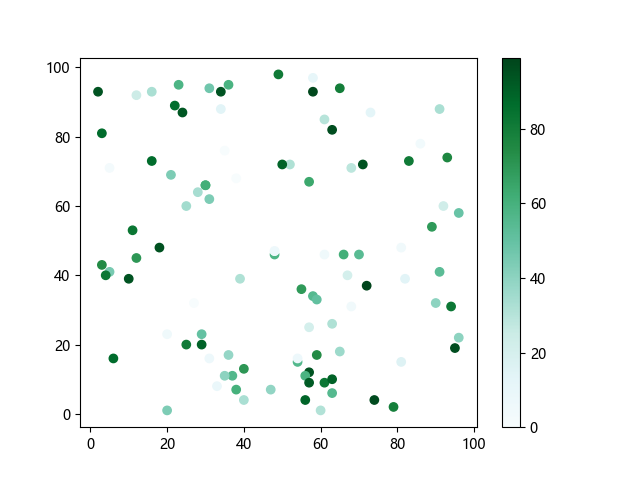 # 这三行代码使编译器能够绘图: import sys import matplotlib matplotlib.use('Agg') import matplotlib.pyplot as plt import numpy as np x = np.random.randint(100, size=(100)) y = np.random.randint(100, size=(100)) colors = np.random.randint(100, size=(100)) # 使用蓝绿色渐变绘制散点图: plt.scatter(x, y, c=colors, cmap='BuGn') plt.colorbar() # 显示颜色条 plt.show() # 显示图形 # 这两行代码使编译器能够输出图形: plt.savefig(sys.stdout.buffer) sys.stdout.flush()