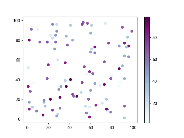 # 这三行代码使编译器能够绘图: import sys import matplotlib matplotlib.use('Agg') import matplotlib.pyplot as plt import numpy as np x = np.random.randint(100, size=(100)) y = np.random.randint(100, size=(100)) colors = np.random.randint(100, size=(100)) # 使用蓝紫色渐变绘制散点图: plt.scatter(x, y, c=colors, cmap='BuPu') plt.colorbar() # 显示颜色条 plt.show() # 显示图形 # 这两行代码使编译器能够输出图形: plt.savefig(sys.stdout.buffer) sys.stdout.flush()