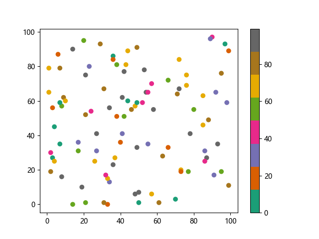 # 这三行代码使编译器能够绘图: import sys import matplotlib matplotlib.use('Agg') import matplotlib.pyplot as plt import numpy as np x = np.random.randint(100, size=(100)) y = np.random.randint(100, size=(100)) colors = np.random.randint(100, size=(100)) # 使用 Dark2 配色方案绘制散点图: plt.scatter(x, y, c=colors, cmap='Dark2') plt.colorbar() plt.show() # 这两行代码使编译器能够输出图形: plt.savefig(sys.stdout.buffer) sys.stdout.flush()