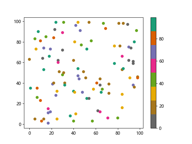 # 这三行代码使编译器能够绘图: import sys import matplotlib matplotlib.use('Agg') import matplotlib.pyplot as plt import numpy as np x = np.random.randint(100, size=(100)) y = np.random.randint(100, size=(100)) colors = np.random.randint(100, size=(100)) # 使用反向 Dark2 配色方案绘制散点图: plt.scatter(x, y, c=colors, cmap='Dark2_r') plt.colorbar() plt.show() # 这两行代码使编译器能够输出图形: plt.savefig(sys.stdout.buffer) sys.stdout.flush()