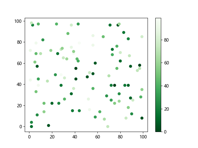 # 这三行代码使编译器能够绘图: import sys import matplotlib matplotlib.use('Agg') import matplotlib.pyplot as plt import numpy as np x = np.random.randint(100, size=(100)) y = np.random.randint(100, size=(100)) colors = np.random.randint(100, size=(100)) # 使用反向绿色渐变绘制散点图: plt.scatter(x, y, c=colors, cmap='Greens_r') plt.colorbar() plt.show() # 这两行代码使编译器能够输出图形: plt.savefig(sys.stdout.buffer) sys.stdout.flush()