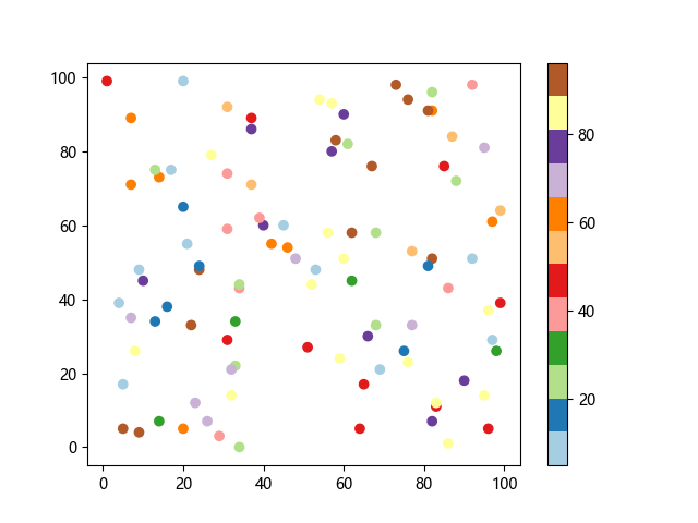 # 这三行代码使编译器能够绘图: import sys import matplotlib matplotlib.use('Agg') import matplotlib.pyplot as plt import numpy as np x = np.random.randint(100, size=(100)) y = np.random.randint(100, size=(100)) colors = np.random.randint(100, size=(100)) # 使用配对色系绘制散点图: plt.scatter(x, y, c=colors, cmap='Paired') plt.colorbar() plt.show() # 这两行代码使编译器能够输出图形: plt.savefig(sys.stdout.buffer) sys.stdout.flush()