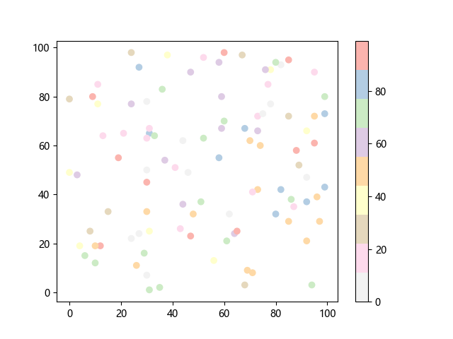 # 这三行代码使编译器能够绘图: import sys import matplotlib matplotlib.use('Agg') import matplotlib.pyplot as plt import numpy as np x = np.random.randint(100, size=(100)) y = np.random.randint(100, size=(100)) colors = np.random.randint(100, size=(100)) # 绘制反向 Pastel1 配色方案的散点图: plt.scatter(x, y, c=colors, cmap='Pastel1_r') plt.colorbar() plt.show() # 这两行代码使编译器能够输出图形: plt.savefig(sys.stdout.buffer) sys.stdout.flush()
