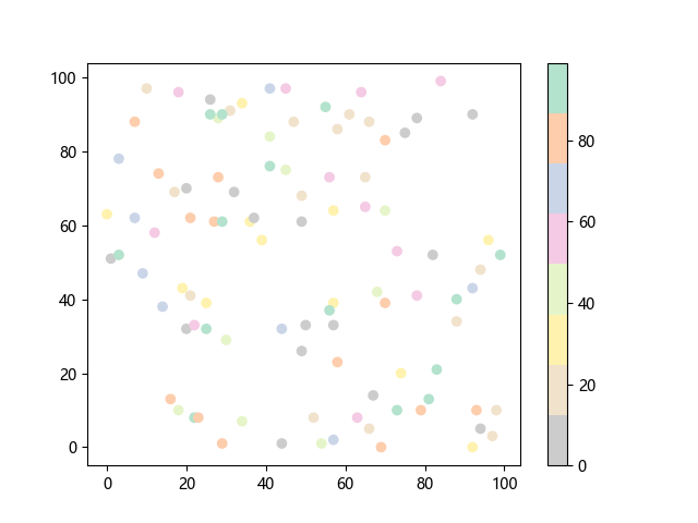 # 这三行代码使编译器能够绘图: import sys import matplotlib matplotlib.use('Agg') import matplotlib.pyplot as plt import numpy as np # 生成 100 个随机 x 坐标: x = np.random.randint(100, size=(100)) # 生成 100 个随机 y 坐标: y = np.random.randint(100, size=(100)) # 生成 100 个随机颜色值: colors = np.random.randint(100, size=(100)) # 绘制彩色散点图 plt.scatter(x, y, c=colors, cmap='Pastel2_r') plt.colorbar() # 显示颜色条 plt.show() # 显示图形 # 这两行代码使编译器能够输出图形: plt.savefig(sys.stdout.buffer) sys.stdout.flush()