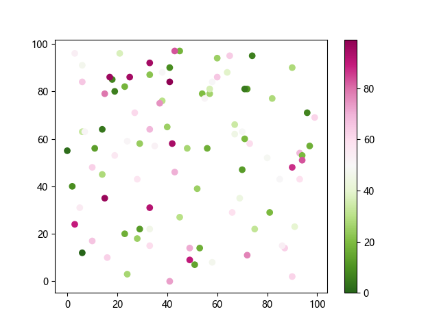 # 这三行代码使编译器能够绘图: import sys import matplotlib matplotlib.use('Agg') import matplotlib.pyplot as plt import numpy as np # 生成随机数据: x = np.random.randint(100, size=(100)) y = np.random.randint(100, size=(100)) colors = np.random.randint(100, size=(100)) # 使用 PiYG_r 配色方案绘制粉绿反向渐变色散点图: plt.scatter(x, y, c=colors, cmap='PiYG_r') plt.colorbar() # 显示颜色条 plt.show() # 显示图形 # 这两行代码使编译器能够输出图形: plt.savefig(sys.stdout.buffer) sys.stdout.flush()