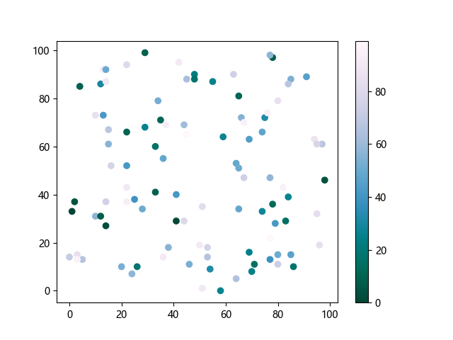 # 这三行代码使编译器能够绘图: import sys import matplotlib matplotlib.use('Agg') import matplotlib.pyplot as plt import numpy as np # 生成随机数据: x = np.random.randint(100, size=(100)) y = np.random.randint(100, size=(100)) colors = np.random.randint(100, size=(100)) # 使用 PuBuGn_r 配色方案绘制紫蓝绿反向渐变色散点图: plt.scatter(x, y, c=colors, cmap='PuBuGn_r') plt.colorbar() # 显示颜色条 plt.show() # 显示图形 # 这两行代码使编译器能够输出图形: plt.savefig(sys.stdout.buffer) sys.stdout.flush()
