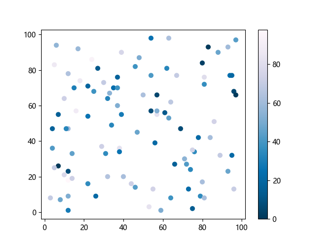 # 这三行代码使编译器能够绘图: import sys import matplotlib matplotlib.use('Agg') import matplotlib.pyplot as plt import numpy as np # 生成随机数据: x = np.random.randint(100, size=(100)) y = np.random.randint(100, size=(100)) colors = np.random.randint(100, size=(100)) # 使用 PuBu_r 配色方案绘制紫蓝色反向渐变色散点图: plt.scatter(x, y, c=colors, cmap='PuBu_r') plt.colorbar() # 显示颜色条 plt.show() # 显示图形 # 这两行代码使编译器能够输出图形: plt.savefig(sys.stdout.buffer) sys.stdout.flush()