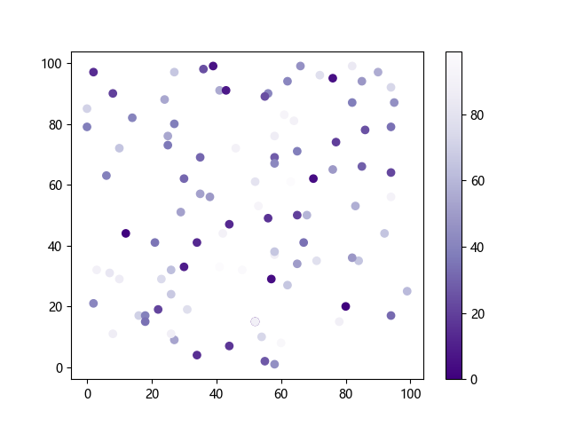# 这三行代码使编译器能够绘图: import sys import matplotlib matplotlib.use('Agg') import matplotlib.pyplot as plt import numpy as np # 生成随机数据: x = np.random.randint(100, size=(100)) y = np.random.randint(100, size=(100)) colors = np.random.randint(100, size=(100)) # 使用 Purples_r 配色方案绘制紫色反向渐变色散点图: plt.scatter(x, y, c=colors, cmap='Purples_r') plt.colorbar() # 显示颜色条 plt.show() # 显示图形 # 这两行代码使编译器能够输出图形: plt.savefig(sys.stdout.buffer) sys.stdout.flush()