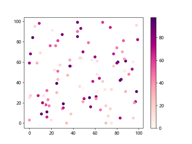 # 这三行代码使编译器能够绘图: import sys import matplotlib matplotlib.use('Agg') import matplotlib.pyplot as plt import numpy as np # 生成随机数据 x = np.random.randint(100, size=(100)) y = np.random.randint(100, size=(100)) colors = np.random.randint(100, size=(100)) # 使用 RdPu 配色方案绘制红紫色渐变色散点图: plt.scatter(x, y, c=colors, cmap='RdPu') plt.colorbar() # 显示颜色条 plt.show() # 显示图形 # 这两行代码使编译器能够输出图形: plt.savefig(sys.stdout.buffer) sys.stdout.flush()