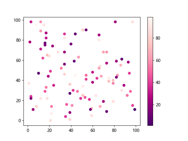 # 这三行代码使编译器能够绘图: import sys import matplotlib matplotlib.use('Agg') import matplotlib.pyplot as plt import numpy as np # 生成随机数据: x = np.random.randint(100, size=(100)) y = np.random.randint(100, size=(100)) colors = np.random.randint(100, size=(100)) # 使用 RdPu_r 配色方案绘制红紫色反向渐变色散点图: plt.scatter(x, y, c=colors, cmap='RdPu_r') plt.colorbar() # 显示颜色条 plt.show() # 显示图形 # 这两行代码使编译器能够输出图形: plt.savefig(sys.stdout.buffer) sys.stdout.flush()
