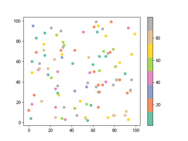 # 这三行代码使编译器能够绘图: import sys import matplotlib matplotlib.use('Agg') import matplotlib.pyplot as plt import numpy as np # 生成随机数据: x = np.random.randint(100, size=(100)) y = np.random.randint(100, size=(100)) colors = np.random.randint(100, size=(100)) # 使用 Set2 (8 色调色板)配色方案绘制 Set2 离散色散点图: plt.scatter(x, y, c=colors, cmap='Set2') plt.colorbar() # 显示颜色条 plt.show() # 显示图形 # 这两行代码使编译器能够输出图形: plt.savefig(sys.stdout.buffer) sys.stdout.flush()