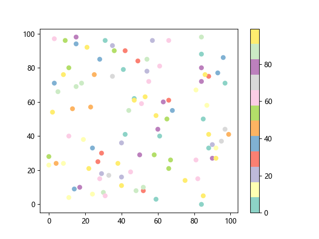# 这三行代码使编译器能够绘图: import sys import matplotlib matplotlib.use('Agg') import matplotlib.pyplot as plt import numpy as np # 生成随机数据: x = np.random.randint(100, size=(100)) y = np.random.randint(100, size=(100)) colors = np.random.randint(100, size=(100)) # 使用 Set3 (12 色调色板)配色方案绘制 Set3 离散色散点图: plt.scatter(x, y, c=colors, cmap='Set3') plt.colorbar() # 显示颜色条 plt.show() # 显示图形 # 这两行代码使编译器能够输出图形: plt.savefig(sys.stdout.buffer) sys.stdout.flush()