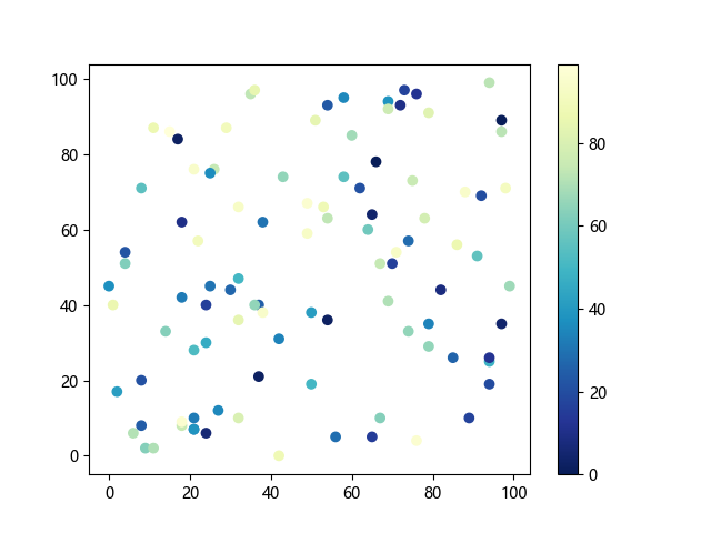 # 这三行代码使编译器能够绘图: import sys import matplotlib matplotlib.use('Agg') import matplotlib.pyplot as plt import numpy as np # 生成随机数据点: x = np.random.randint(100, size=(100)) y = np.random.randint(100, size=(100)) colors = np.random.randint(100, size=(100)) # 使用 YlGnBu_r (黄-绿-蓝反向渐变)配色方案绘制散点图: plt.scatter(x, y, c=colors, cmap='YlGnBu_r') plt.colorbar() # 显示颜色条 plt.show() # 显示图形 # 这两行代码使编译器能够输出图形: plt.savefig(sys.stdout.buffer) sys.stdout.flush()