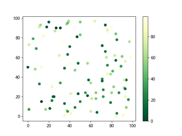 # 这三行代码使编译器能够绘图: import sys import matplotlib matplotlib.use('Agg') import matplotlib.pyplot as plt import numpy as np # 生成随机数据: x = np.random.randint(100, size=(100)) y = np.random.randint(100, size=(100)) colors = np.random.randint(100, size=(100)) # 使用YlGn_r(黄-绿反向渐变)配色方案绘制散点图: plt.scatter(x, y, c=colors, cmap='YlGn_r') plt.colorbar() # 显示颜色条 plt.show() # 显示图形 # 这两行代码使编译器能够输出图形: plt.savefig(sys.stdout.buffer) sys.stdout.flush()