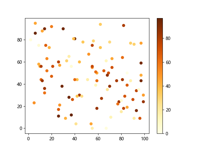 # 这三行代码使编译器能够绘图: import sys import matplotlib matplotlib.use('Agg') import matplotlib.pyplot as plt import numpy as np # 生成随机数据: x = np.random.randint(100, size=(100)) y = np.random.randint(100, size=(100)) colors = np.random.randint(100, size=(100)) # 使用 YlOrBr (黄-橙-棕渐变)配色方案绘制黄橙棕渐变散点图: plt.scatter(x, y, c=colors, cmap='YlOrBr') plt.colorbar() # 显示颜色条 plt.show() # 显示图形 # 这两行代码使编译器能够输出图形: plt.savefig(sys.stdout.buffer) sys.stdout.flush()