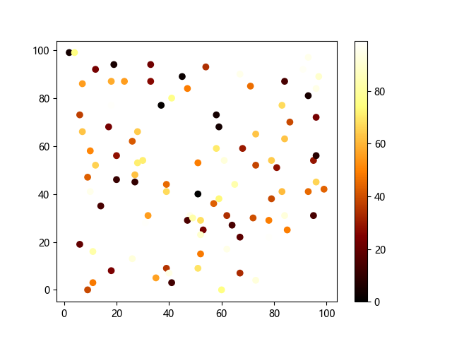 # 这三行代码使编译器能够绘图: import sys import matplotlib matplotlib.use('Agg') import matplotlib.pyplot as plt import numpy as np # 生成随机数据: x = np.random.randint(100, size=(100)) y = np.random.randint(100, size=(100)) colors = np.random.randint(100, size=(100)) # 使用 afmhot (热金属)配色方案绘制热金属色散点图: plt.scatter(x, y, c=colors, cmap='afmhot') plt.colorbar() # 显示颜色条 plt.show() # 显示图形 # 这两行代码使编译器能够输出图形: plt.savefig(sys.stdout.buffer) sys.stdout.flush()
