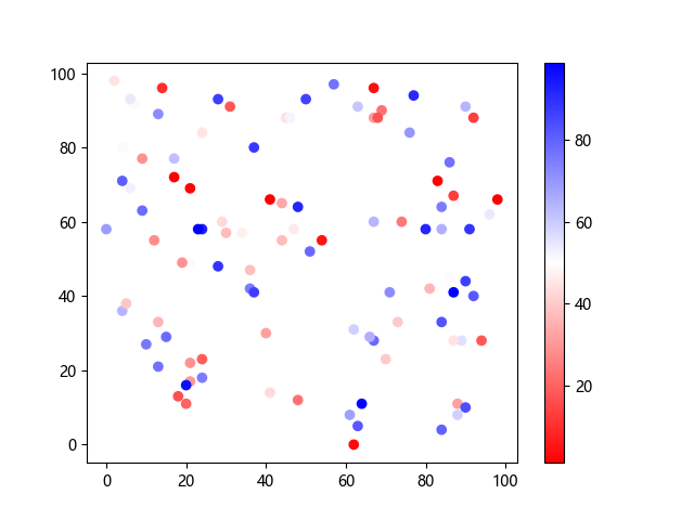 # 这三行代码使编译器能够绘图: import sys import matplotlib matplotlib.use('Agg') import matplotlib.pyplot as plt import numpy as np # 生成随机数据点 x = np.random.randint(100, size=(100)) y = np.random.randint(100, size=(100)) colors = np.random.randint(100, size=(100)) # 使用 bwr_r 配色方案绘制蓝白红反向渐变色散点图: plt.scatter(x, y, c=colors, cmap='bwr_r') plt.colorbar() plt.show() # 这两行代码使编译器能够输出图形: plt.savefig(sys.stdout.buffer) sys.stdout.flush()