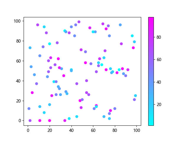 # 这三行代码使编译器能够绘图: import sys import matplotlib matplotlib.use('Agg') import matplotlib.pyplot as plt import numpy as np # 生成随机数据 x = np.random.randint(100, size=(100)) y = np.random.randint(100, size=(100)) colors = np.random.randint(100, size=(100)) # 使用 cool 配色方案绘制冷色调渐变色散点图: plt.scatter(x, y, c=colors, cmap='cool') plt.colorbar() plt.show() # 这两行代码使编译器能够输出图形: plt.savefig(sys.stdout.buffer) sys.stdout.flush()