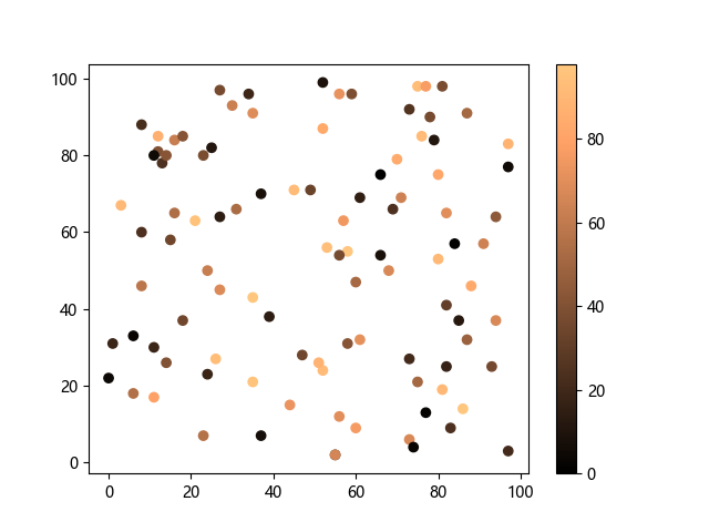 # 这三行代码使编译器能够绘图: import sys import matplotlib matplotlib.use('Agg') import matplotlib.pyplot as plt import numpy as np # 生成随机数据 x = np.random.randint(100, size=(100)) y = np.random.randint(100, size=(100)) colors = np.random.randint(100, size=(100)) # 使用 copper 配色方案绘制铜色渐变色散点图: plt.scatter(x, y, c=colors, cmap='copper') plt.colorbar() plt.show() # 这两行代码使编译器能够输出图形: plt.savefig(sys.stdout.buffer) sys.stdout.flush()