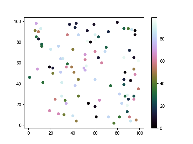 # 这三行代码使编译器能够绘图: import sys import matplotlib matplotlib.use('Agg') import matplotlib.pyplot as plt import numpy as np # 生成随机数据 x = np.random.randint(100, size=(100)) y = np.random.randint(100, size=(100)) colors = np.random.randint(100, size=(100)) # 使用 cubehelix 配色方案绘制螺旋立方体渐变色散点图: plt.scatter(x, y, c=colors, cmap='cubehelix') plt.colorbar() plt.show() # 这两行代码使编译器能够输出图形: plt.savefig(sys.stdout.buffer) sys.stdout.flush()