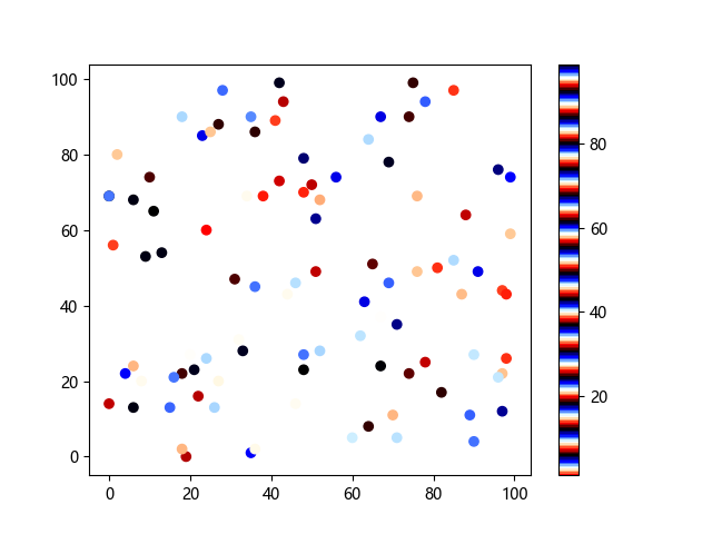 # 这三行代码使编译器能够绘图: import sys import matplotlib matplotlib.use('Agg') import matplotlib.pyplot as plt import numpy as np # 生成随机数据 x = np.random.randint(100, size=(100)) y = np.random.randint(100, size=(100)) colors = np.random.randint(100, size=(100)) # 使用 flag 配色方案绘制旗帜渐变色散点图: plt.scatter(x, y, c=colors, cmap='flag') plt.colorbar() plt.show() # 这两行代码使编译器能够输出图形: plt.savefig(sys.stdout.buffer) sys.stdout.flush()