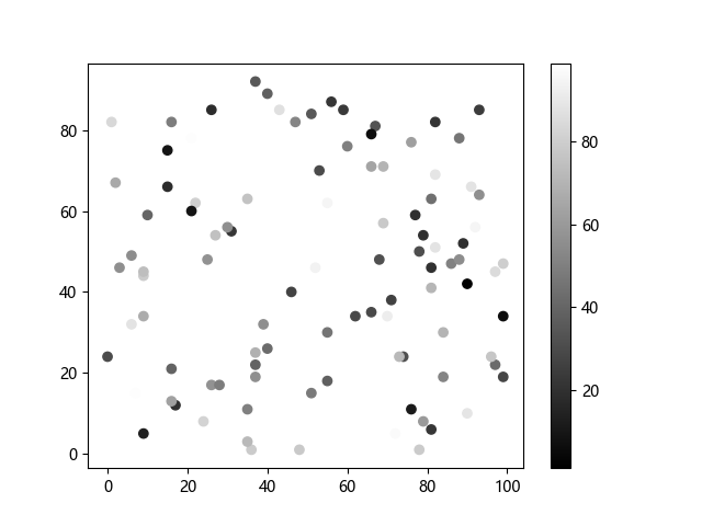 # 这三行代码使编译器能够绘图: import sys import matplotlib matplotlib.use('Agg') import matplotlib.pyplot as plt import numpy as np # 生成随机数据 x = np.random.randint(100, size=(100)) y = np.random.randint(100, size=(100)) colors = np.random.randint(100, size=(100)) # 使用 gist_gray 配色方案绘制灰度渐变色散点图: plt.scatter(x, y, c=colors, cmap='gist_gray') plt.colorbar() plt.show() # 这两行代码使编译器能够输出图形: plt.savefig(sys.stdout.buffer) sys.stdout.flush()