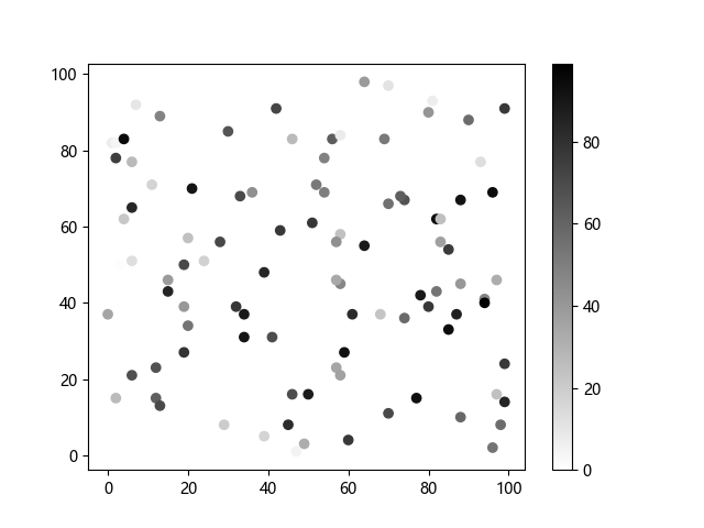 # 这三行代码使编译器能够绘图: import sys import matplotlib matplotlib.use('Agg') import matplotlib.pyplot as plt import numpy as np # 生成随机数据点 x = np.random.randint(100, size=(100)) y = np.random.randint(100, size=(100)) colors = np.random.randint(100, size=(100)) # 使用 gist_gray_r 配色方案绘制灰度反向渐变色散点图: plt.scatter(x, y, c=colors, cmap='gist_gray_r') plt.colorbar() plt.show() # 这两行代码使编译器能够输出图形: plt.savefig(sys.stdout.buffer) sys.stdout.flush()