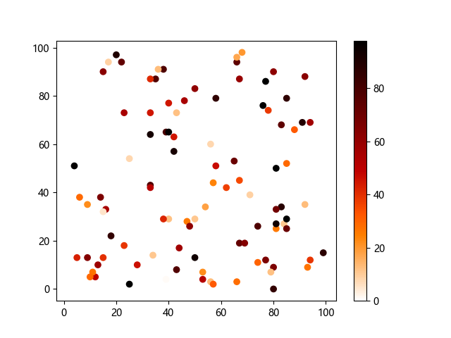 # 这三行代码使编译器能够绘图: import sys import matplotlib matplotlib.use('Agg') import matplotlib.pyplot as plt import numpy as np # 生成随机数据点 x = np.random.randint(100, size=(100)) y = np.random.randint(100, size=(100)) colors = np.random.randint(100, size=(100)) # 使用 gist_heat_r 配色方案绘制热力图反向渐变色散点图: plt.scatter(x, y, c=colors, cmap='gist_heat_r') plt.colorbar() plt.show() # 这两行代码使编译器能够输出图形: plt.savefig(sys.stdout.buffer) sys.stdout.flush()