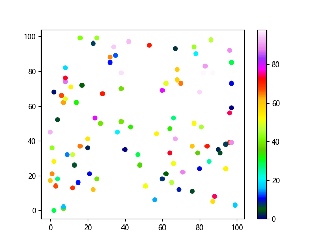 # 这三行代码使编译器能够绘图: import sys import matplotlib matplotlib.use('Agg') import matplotlib.pyplot as plt import numpy as np # 生成随机数据 x = np.random.randint(100, size=(100)) y = np.random.randint(100, size=(100)) colors = np.random.randint(100, size=(100)) # 使用 gist_ncar 配色方案绘制NCAR渐变色散点图: plt.scatter(x, y, c=colors, cmap='gist_ncar') plt.colorbar() plt.show() # 这两行代码使编译器能够输出图形: plt.savefig(sys.stdout.buffer) sys.stdout.flush()