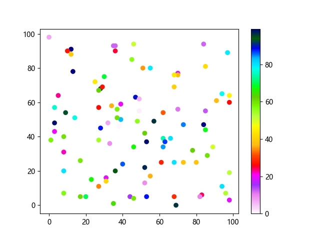 # 这三行代码使编译器能够绘图: import sys import matplotlib matplotlib.use('Agg') import matplotlib.pyplot as plt import numpy as np # 生成随机数据点 x = np.random.randint(100, size=(100)) y = np.random.randint(100, size=(100)) colors = np.random.randint(100, size=(100)) # 使用 gist_ncar_r 配色方案绘制 NCAR 反向渐变色散点图: plt.scatter(x, y, c=colors, cmap='gist_ncar_r') plt.colorbar() plt.show() # 这两行代码使编译器能够输出图形: plt.savefig(sys.stdout.buffer) sys.stdout.flush()