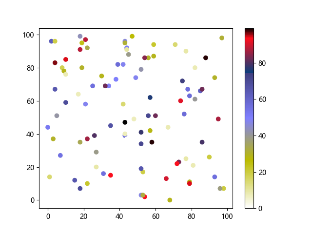 # 这三行代码使编译器能够绘图: import sys import matplotlib matplotlib.use('Agg') import matplotlib.pyplot as plt import numpy as np # 生成随机数据点 x = np.random.randint(100, size=(100)) y = np.random.randint(100, size=(100)) colors = np.random.randint(100, size=(100)) # 使用 gist_stern_r 配色方案绘制星云反向渐变色散点图: plt.scatter(x, y, c=colors, cmap='gist_stern_r') plt.colorbar() plt.show() # 这两行代码使编译器能够输出图形: plt.savefig(sys.stdout.buffer) sys.stdout.flush()