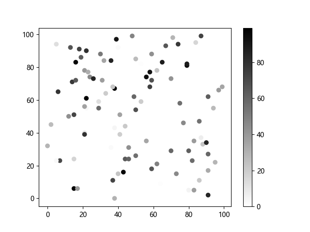 # 这三行代码使编译器能够绘图: import sys import matplotlib matplotlib.use('Agg') import matplotlib.pyplot as plt import numpy as np # 生成随机数据 x = np.random.randint(100, size=(100)) y = np.random.randint(100, size=(100)) colors = np.random.randint(100, size=(100)) # 使用 gist_yarg 配色方案绘制灰度渐变色散点图: plt.scatter(x, y, c=colors, cmap='gist_yarg') plt.colorbar() plt.show() # 这两行代码使编译器能够输出图形: plt.savefig(sys.stdout.buffer) sys.stdout.flush()