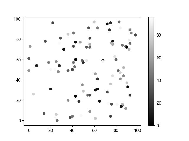 # 这三行代码使编译器能够绘图: import sys import matplotlib matplotlib.use('Agg') import matplotlib.pyplot as plt import numpy as np # 生成随机数据点 x = np.random.randint(100, size=(100)) y = np.random.randint(100, size=(100)) colors = np.random.randint(100, size=(100)) # 使用 gist_yarg_r 配色方案绘制灰度反向渐变色散点图: plt.scatter(x, y, c=colors, cmap='gist_yarg_r') plt.colorbar() plt.show() # 这两行代码使编译器能够输出图形: plt.savefig(sys.stdout.buffer) sys.stdout.flush()