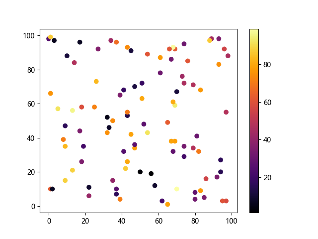 # 这三行代码使编译器能够绘图: import sys import matplotlib matplotlib.use('Agg') import matplotlib.pyplot as plt import numpy as np # 生成随机数据 x = np.random.randint(100, size=(100)) y = np.random.randint(100, size=(100)) colors = np.random.randint(100, size=(100)) # 使用 inferno 配色方案绘制地狱火渐变色散点图: plt.scatter(x, y, c=colors, cmap='inferno') plt.colorbar() plt.show() # 这两行代码使编译器能够输出图形: plt.savefig(sys.stdout.buffer) sys.stdout.flush()
