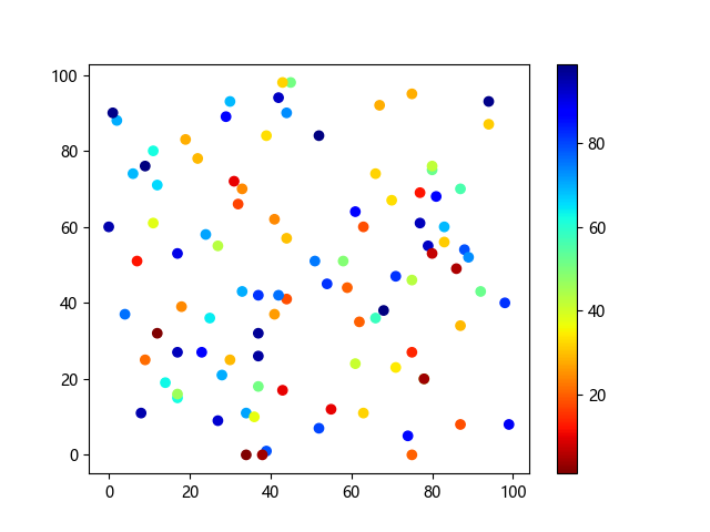 # 这三行代码使编译器能够绘图: import sys import matplotlib matplotlib.use('Agg') import matplotlib.pyplot as plt import numpy as np # 生成随机数据点 x = np.random.randint(100, size=(100)) y = np.random.randint(100, size=(100)) colors = np.random.randint(100, size=(100)) # 使用 jet_r 配色方案绘制 Jet 反向渐变色散点图: plt.scatter(x, y, c=colors, cmap='jet_r') plt.colorbar() plt.show() # 这两行代码使编译器能够输出图形: plt.savefig(sys.stdout.buffer) sys.stdout.flush()