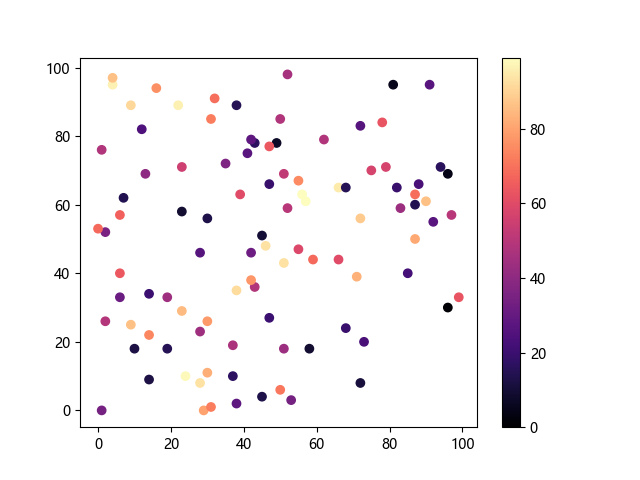 # 这三行代码使编译器能够绘图: import sys import matplotlib matplotlib.use('Agg') import matplotlib.pyplot as plt import numpy as np # 生成随机数据 x = np.random.randint(100, size=(100)) y = np.random.randint(100, size=(100)) colors = np.random.randint(100, size=(100)) # 使用 magma 配色方案绘制岩浆渐变色散点图: plt.scatter(x, y, c=colors, cmap='magma') plt.colorbar() plt.show() # 这两行代码使编译器能够输出图形: plt.savefig(sys.stdout.buffer) sys.stdout.flush()