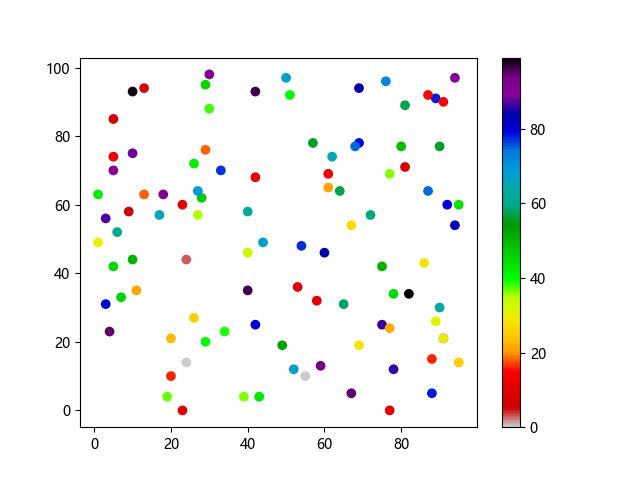 #Three lines to make our compiler able to draw: import sys import matplotlib matplotlib.use('Agg') import matplotlib.pyplot as plt import numpy as np x = np.random.randint(100, size=(100)) y = np.random.randint(100, size=(100)) colors = np.random.randint(100, size=(100)) plt.scatter(x, y, c=colors, cmap='nipy_spectral_r') plt.colorbar() plt.show() #Two lines to make our compiler able to draw: plt.savefig(sys.stdout.buffer) sys.stdout.flush()