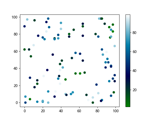 # 这三行代码使编译器能够绘图: import sys import matplotlib matplotlib.use('Agg') import matplotlib.pyplot as plt import numpy as np # 生成随机数据 x = np.random.randint(100, size=(100)) y = np.random.randint(100, size=(100)) colors = np.random.randint(100, size=(100)) # 使用 ocean 配色方案绘制海洋渐变色散点图: plt.scatter(x, y, c=colors, cmap='ocean') plt.colorbar() plt.show() # 这两行代码使编译器能够输出图形: plt.savefig(sys.stdout.buffer) sys.stdout.flush()