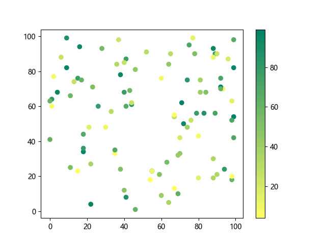 # 以下三行代码使编译器支持绘图功能: import sys import matplotlib matplotlib.use('Agg') import matplotlib.pyplot as plt import numpy as np # 生成随机数据: x = np.random.randint(100, size=(100)) y = np.random.randint(100, size=(100)) colors = np.random.randint(100, size=(100)) # 使用 summer 反向配色方案创建散点图: plt.scatter(x, y, c=colors, cmap='summer_r') plt.colorbar() plt.show() # 以下两行代码使编译器能够输出图形: plt.savefig(sys.stdout.buffer) sys.stdout.flush()