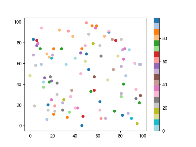 # 以下三行代码使编译器支持绘图功能: import sys import matplotlib matplotlib.use('Agg') import matplotlib.pyplot as plt import numpy as np # 生成随机数据: x = np.random.randint(100, size=(100)) y = np.random.randint(100, size=(100)) colors = np.random.randint(100, size=(100)) # 使用 tab20 反向离散配色方案创建散点图: plt.scatter(x, y, c=colors, cmap='tab20_r') plt.colorbar() plt.show() # 以下两行代码使编译器能够输出图形: plt.savefig(sys.stdout.buffer) sys.stdout.flush()