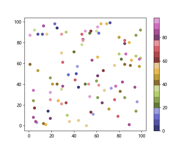 # 以下三行代码使编译器支持绘图功能: import sys import matplotlib matplotlib.use('Agg') import matplotlib.pyplot as plt import numpy as np # 生成随机数据: x = np.random.randint(100, size=(100)) y = np.random.randint(100, size=(100)) colors = np.random.randint(100, size=(100)) # 使用 tab20b 离散配色方案创建散点图: plt.scatter(x, y, c=colors, cmap='tab20b') plt.colorbar() plt.show() # 以下两行代码使编译器能够输出图形: plt.savefig(sys.stdout.buffer) sys.stdout.flush()