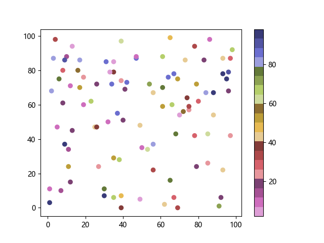 # 以下三行代码使编译器支持绘图功能: import sys import matplotlib matplotlib.use('Agg') import matplotlib.pyplot as plt import numpy as np # 生成随机数据: x = np.random.randint(100, size=(100)) y = np.random.randint(100, size=(100)) colors = np.random.randint(100, size=(100)) # 使用 tab20b 反向离散配色方案创建散点图: plt.scatter(x, y, c=colors, cmap='tab20b_r') plt.colorbar() plt.show() # 以下两行代码使编译器能够输出图形: plt.savefig(sys.stdout.buffer) sys.stdout.flush()
