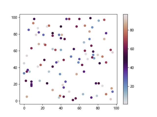 # 以下三行代码使编译器支持绘图功能: import sys import matplotlib matplotlib.use('Agg') import matplotlib.pyplot as plt import numpy as np # 生成随机数据: x = np.random.randint(100, size=(100)) y = np.random.randint(100, size=(100)) colors = np.random.randint(100, size=(100)) # 使用 twilight 配色方案创建散点图: plt.scatter(x, y, c=colors, cmap='twilight') plt.colorbar() plt.show() # 以下两行代码使编译器能够输出图形: plt.savefig(sys.stdout.buffer) sys.stdout.flush()