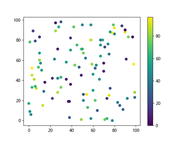 # 以下三行代码使编译器支持绘图功能: import sys import matplotlib matplotlib.use('Agg') import matplotlib.pyplot as plt import numpy as np # 生成随机数据: x = np.random.randint(100, size=(100)) y = np.random.randint(100, size=(100)) colors = np.random.randint(100, size=(100)) # 使用 viridis 配色方案创建散点图: plt.scatter(x, y, c=colors, cmap='viridis') plt.colorbar() plt.show() # 以下两行代码使编译器能够输出图形: plt.savefig(sys.stdout.buffer) sys.stdout.flush()