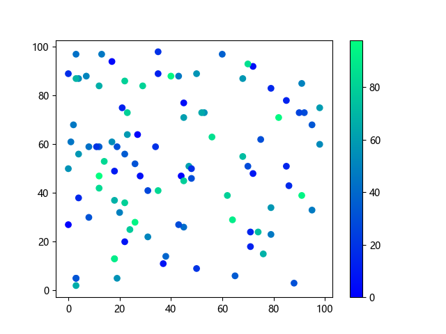 # 以下三行代码使编译器支持绘图功能: import sys import matplotlib matplotlib.use('Agg') import matplotlib.pyplot as plt import numpy as np # 生成随机数据: x = np.random.randint(100, size=(100)) y = np.random.randint(100, size=(100)) colors = np.random.randint(100, size=(100)) # 使用冬季 (winter) 配色方案创建散点图: plt.scatter(x, y, c=colors, cmap='winter') plt.colorbar() plt.show() # 以下两行代码使编译器能够输出图形: plt.savefig(sys.stdout.buffer) sys.stdout.flush()