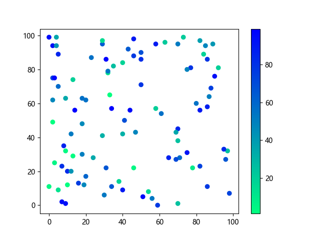 # 以下三行代码使编译器支持绘图功能: import sys import matplotlib matplotlib.use('Agg') import matplotlib.pyplot as plt import numpy as np # 生成随机数据: x = np.random.randint(100, size=(100)) y = np.random.randint(100, size=(100)) colors = np.random.randint(100, size=(100)) # 使用冬季反向 (winter_r) 配色方案创建散点图: plt.scatter(x, y, c=colors, cmap='winter_r') plt.colorbar() plt.show() # 以下两行代码使编译器能够输出图形: plt.savefig(sys.stdout.buffer) # 将图形保存到标准输出缓冲区 sys.stdout.flush() # 刷新输出缓冲区